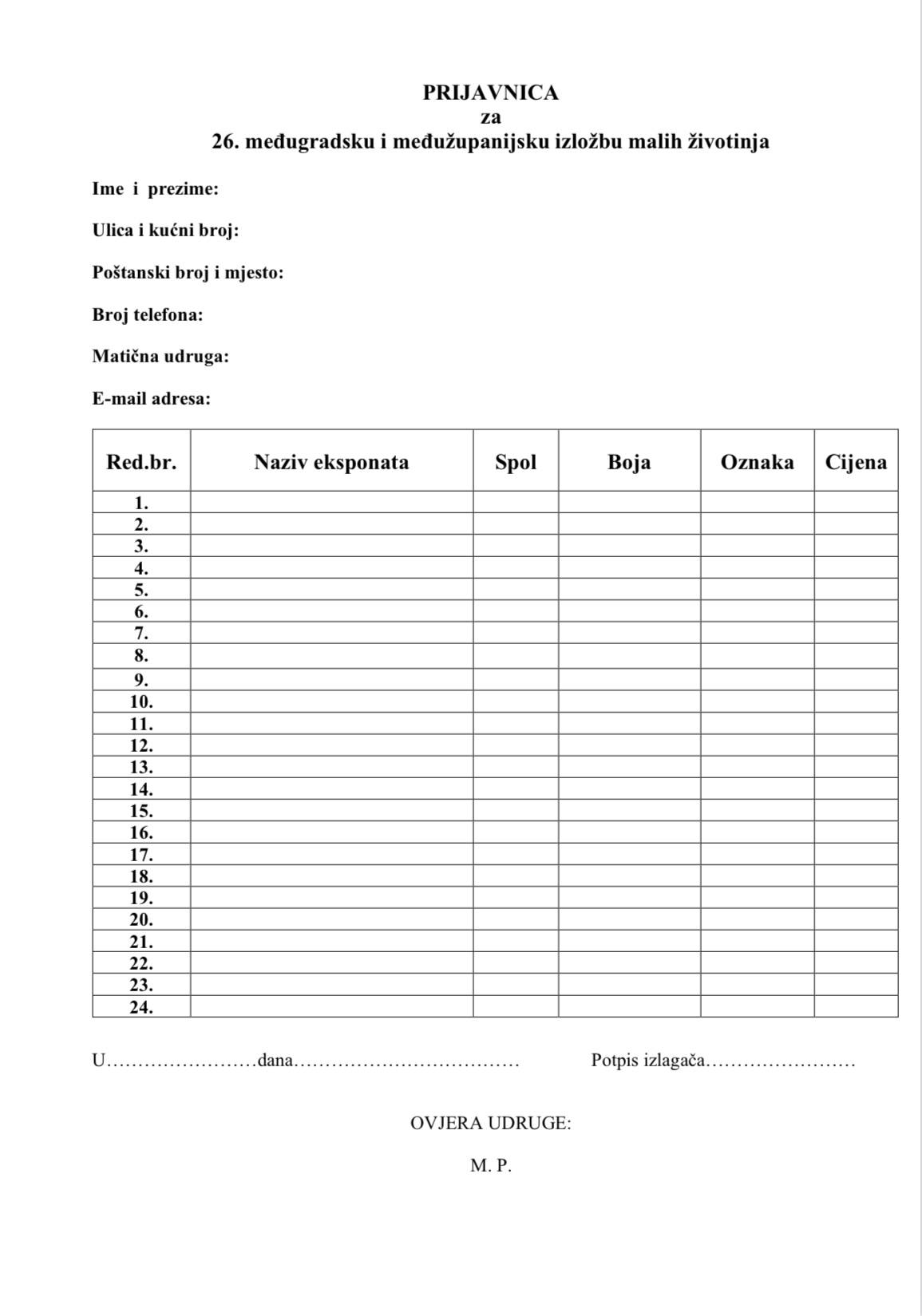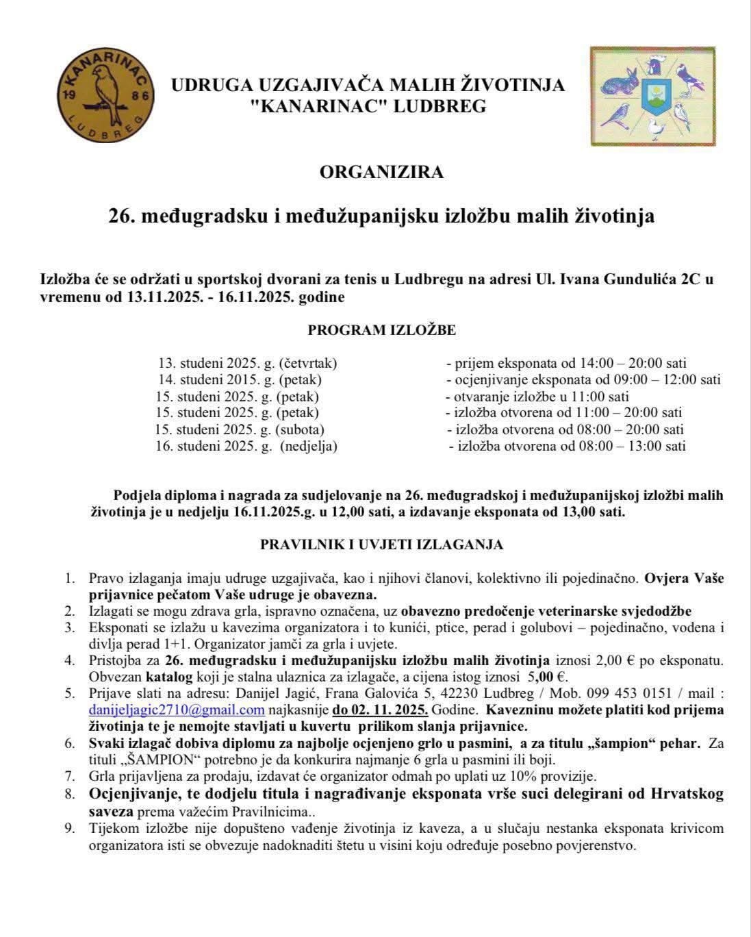 Udruga uzgajatelja malih životinja "Kanarinac" Ludbreg, poziva sve zainteresirane uzgajivače, članove udruga HSUGPKPZ i udruga članica stranih saveza da u skladu s uvjetima izlaganja, prijave svoje životinje na 26. međugradsku i međužupanijsku izložbu malih životinja.Izložba će se održati od 14 - 16. 11.2025. u Ludbregu u sportskoj dvorani "Tenis", ulica Ivana Gundulića 2C.