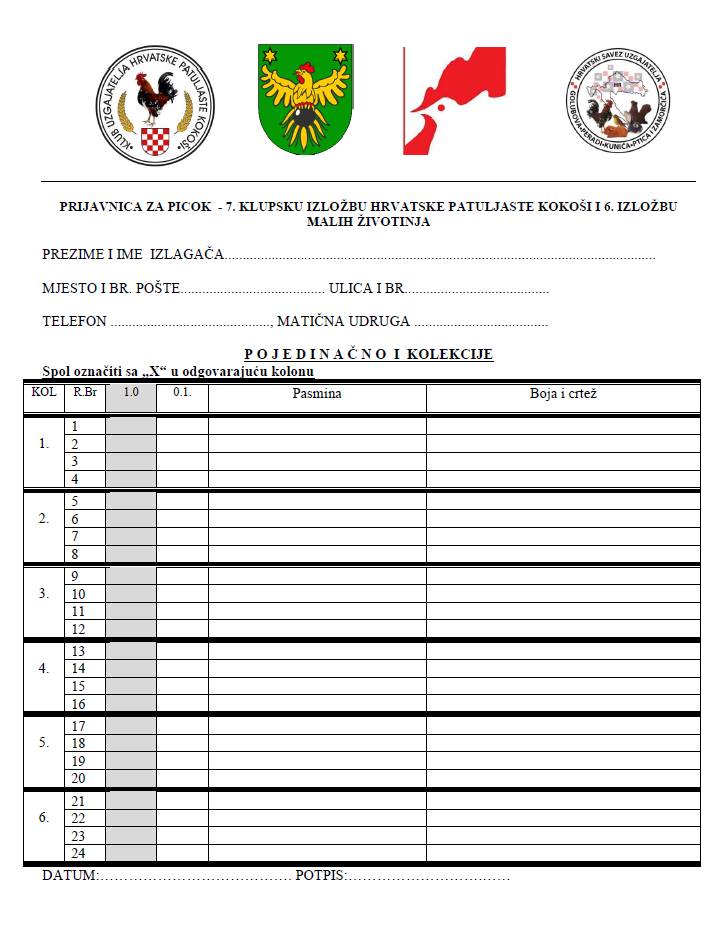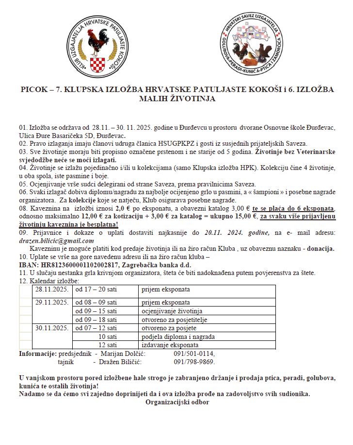 Klub uzgajatelja hrvatske patuljate kokoši, poziva sve zainteresirane uzgajivače, članove udruga HSUGPKPZ i udruga članica stranih saveza da u skladu s uvjetima izlaganja, prijave svoje životinje na 7. klupskoj izložbi hrvatske patuljaste kokoši i 6. izložbi malih životinja.Izložba će se održati od 29 - 30. 11.2025. u Đurđevcu u sportskoj dvorani OŠ Đurđevac, Đure Basaričeka 5d Đurđevac.