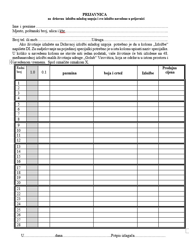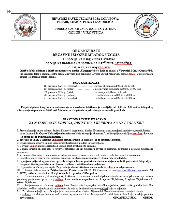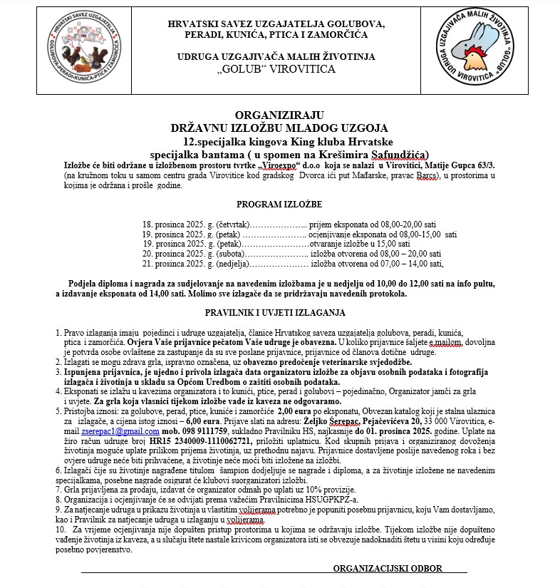 Udruga uzgajivača malih životinja "Golub" Virovitica, poziva sve zainteresirane uzgajivače, članove udruga HSUGPKPZ i udruga članica stranih saveza da u skladu s uvjetima izlaganja, prijave svoje životinje na Državnu izložbu mladog uzgoja malih životinja i popratne specijalne izložbe.Izložba će se održati od 19 - 21. 12.2025. na prostoru VIROEXPO-a, Matije Gupca 63/3, 33000 Virovitica.